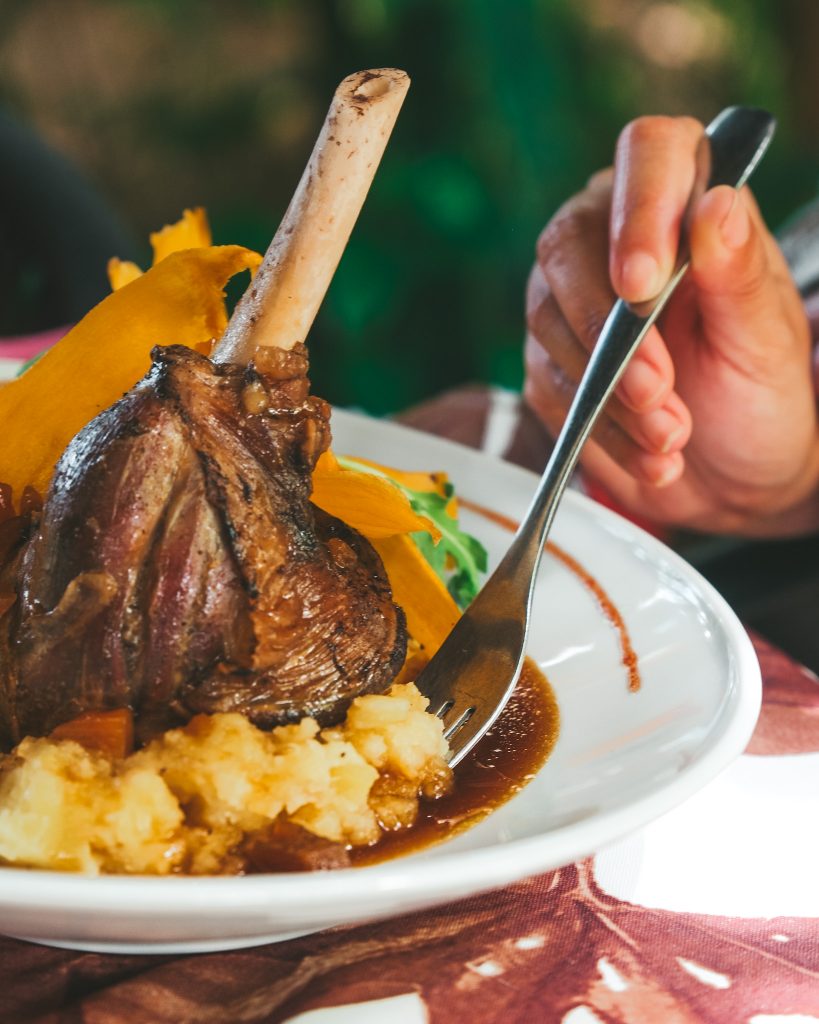 Souris d’agneau confite au vin et aux épices, banane plantain et écrasé de pommes de terre, pétales de patates douce, sauce curry léger et Ananas